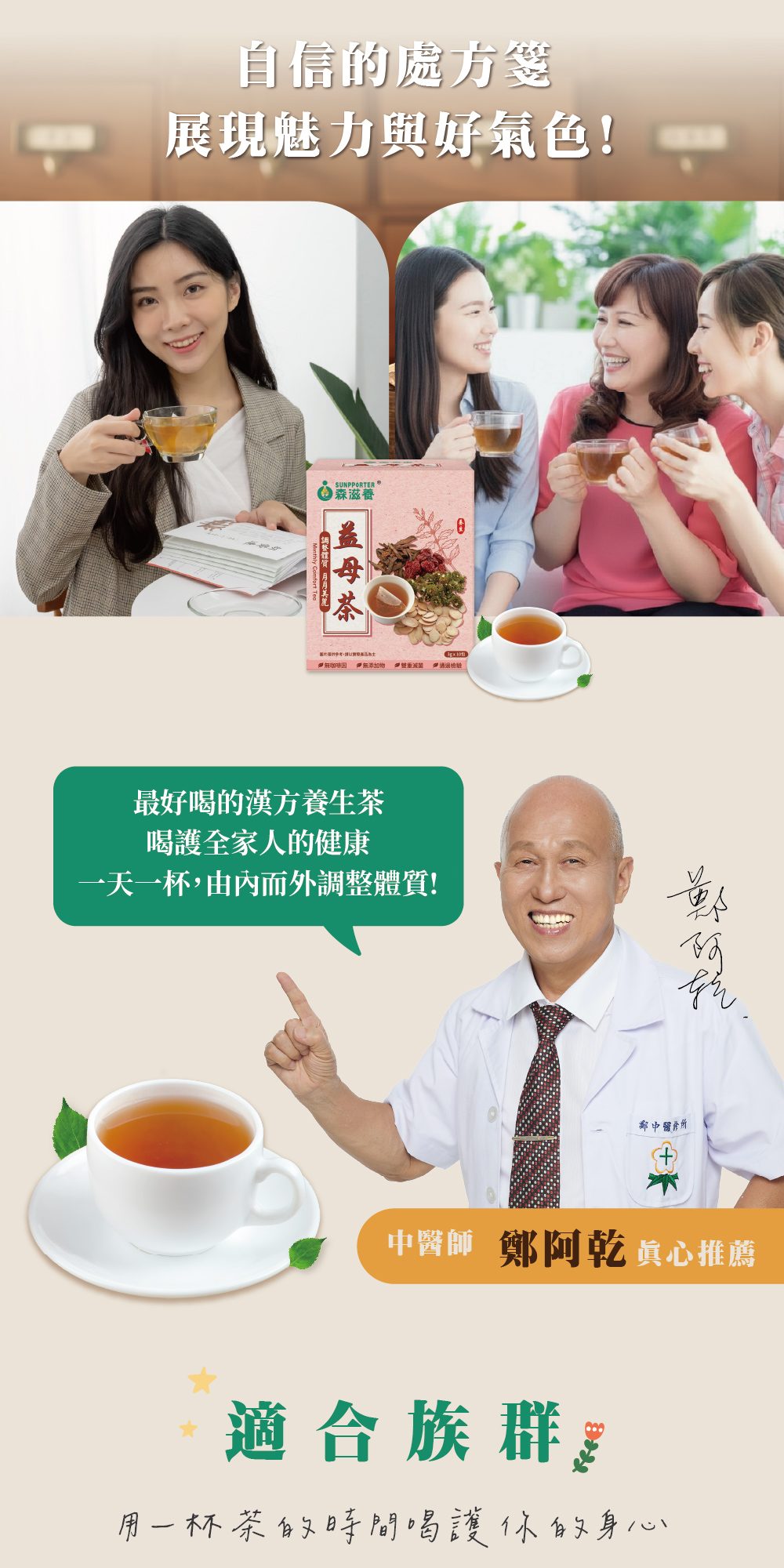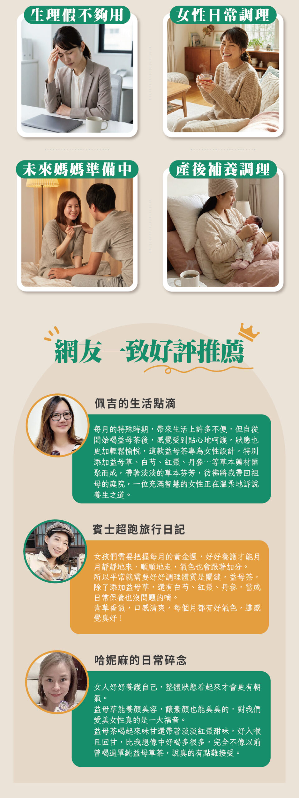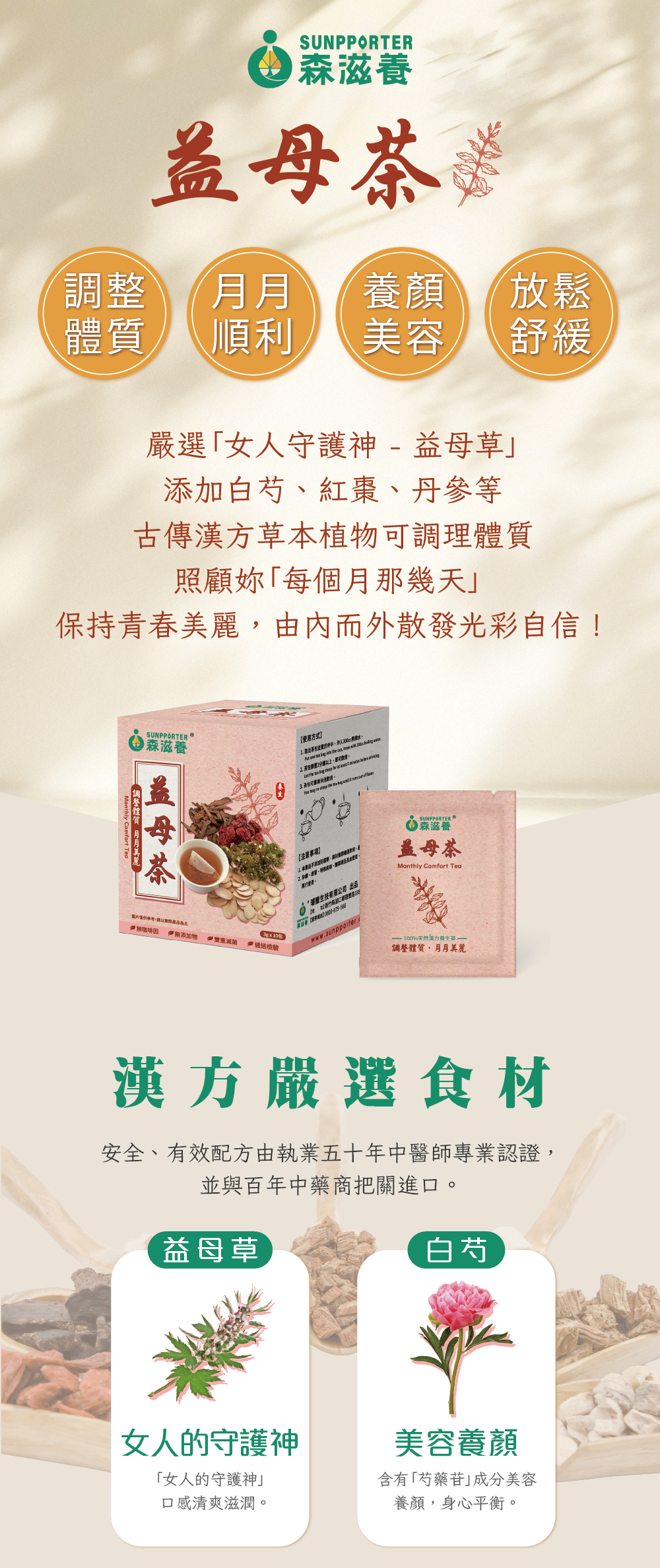 嚴選「女人守護神 – 益母草」添加白芍、紅棗、丹參等古傳漢方草本植物,可調理體質,照顧妳「每個月那幾天」,保持青春美麗,由內而外散發光彩自信!